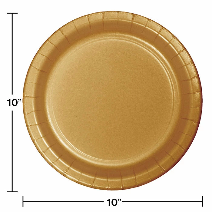 Details: Measuring 10.25 inches, the Glittering Gold Banquet Plates are generously sized for buffet service, main meals, or holding an assortment of appetizer selections, sandwiches and salads. The slightly elevated rim helps contain the food on the plate. The Glittering Gold collection is part of our Touch of Color brand. Match the plates with the other Glittering Gold party supplies for a complete table ensemble. One package includes 24 plates For this price, you get one package containing (24) Glittering Gold Banquet Plates. Approximate Dimensions: 10 in x 10 in