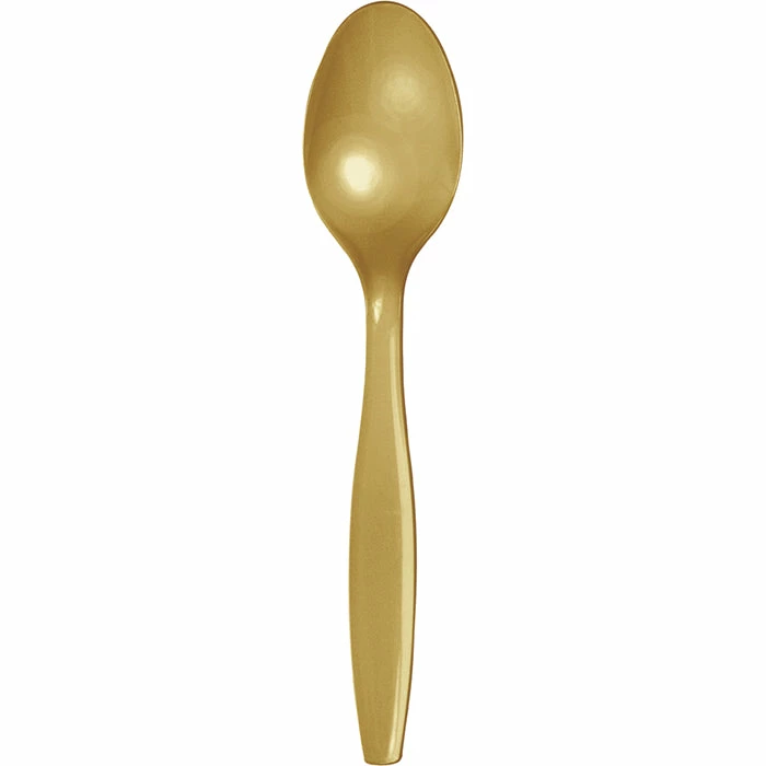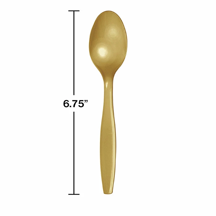 Details: Create an upscale dining experience with our Glittering Gold Plastic Spoons. Our wholesale plastic spoons are a perfect combination of golden color, quality and convenience at a great price. These wholesale disposable spoons are super sturdy, they’re recyclable, and this disposable cutlery allows for fast clean-up after events. These shimmery gold spoons coordinate perfectly with our entire collection of Glittering Gold party supplies. For this price, you get one package containing (24) Glittering Gold Plastic Spoons. Approximate Dimensions: 6 in