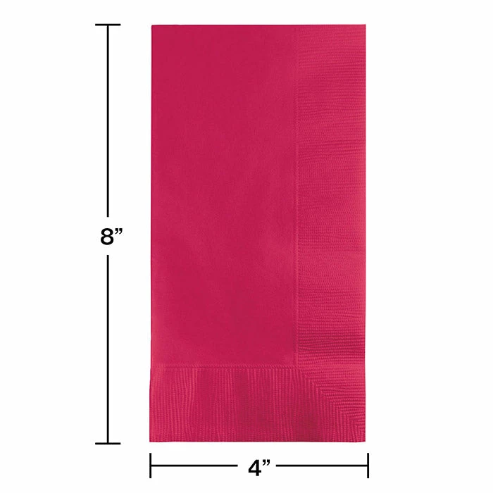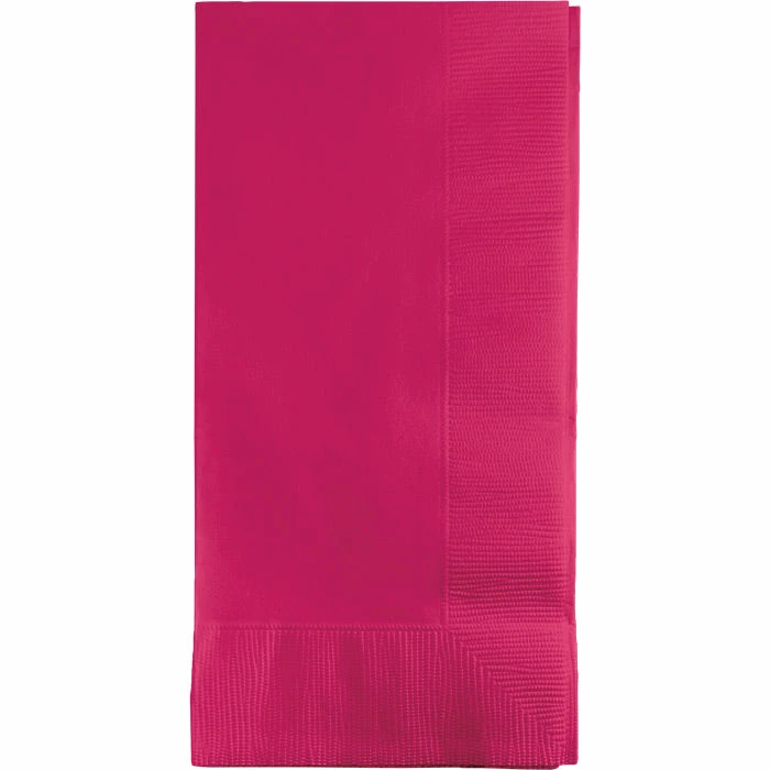 Details: Create a more formal atmosphere and add classy color to your celebration or catered event with the Hot Magenta Dinner Napkins. Each folded 2-ply paper napkin measures 4 inches x 8 inches and every value package contains 50 napkins. Arrange the napkin next to place settings for more style or fan out a group of napkins with cutlery at the beginning of a buffet table or dessert display. The bright pink is perfect for birthdays, weddings, receptions and more. There are plenty of uses for this brilliant napkin. The Hot Magenta Dinner Napkins arrive in packages of 50 each. For this price, you get one package containing (50) Hot Magenta Dinner Napkins 2Ply 1/8 Fold. Approximate Dimensions: 8 in x 4 in