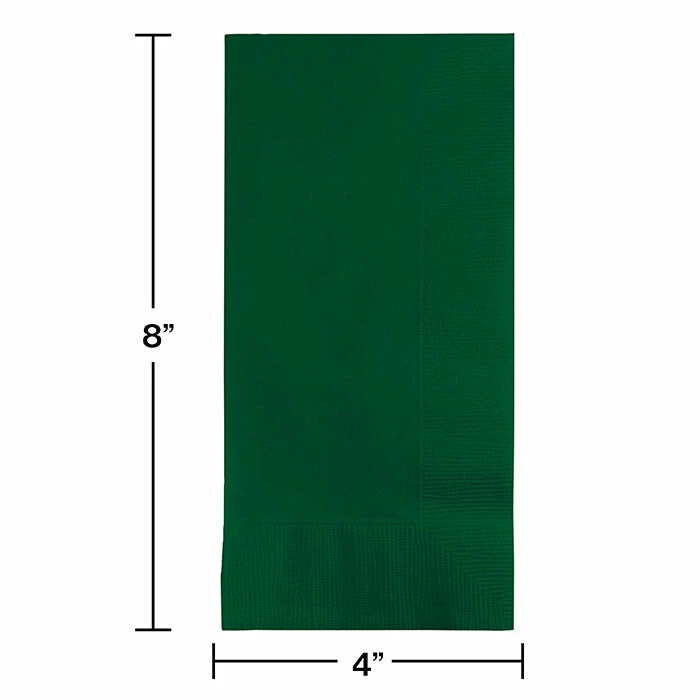 Details: Create a more formal presentation at your celebration or catered event with the Hunter Green Dinner Napkins. Each folded paper napkin measures 4 inches x 8 inches and every package contains 50 napkins. Lay this napkin next to place settings for a more stylish appearance or fan out a group of napkins next to the start of a buffet table or dessert display. The hunter green color is perfect for numerous holiday affairs, weddings, graduations or receptions. There are plenty of uses for this fancy napkin. The Hunter Green Dinner Napkins are sold in packages of 50. For this price, you get one package containing (50) Hunter Green Dinner Napkins 2Ply 1/8 Fold. Approximate Dimensions: 8 in x 4 in