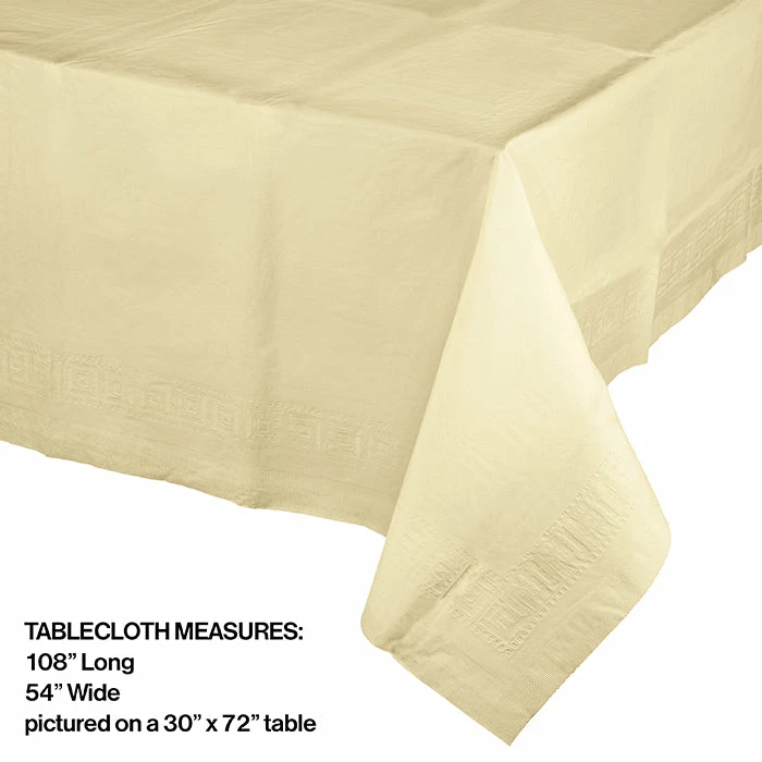Details: Decorate the tables at larger gatherings or catered events with a fresh, sophisticated look with the Ivory Paper table covers. Each rectangular table cover measures 54 inches x 108 inches and is made from high-quality 2-ply tissue with a poly lining and a waterproof backing to protect tables. The ivory color is perfect to use as a complementary color for theme ensemble products at receptions, showers or graduations. The Ivory Paper table cover is sold at a discount price. You get one Ivory Tablecover 54″X 108″ Polylined Tissue for this price. Approximate Dimensions: 108 in x 54 in