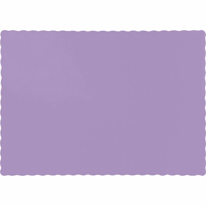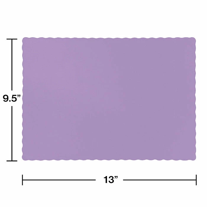 Details: For those larger gatherings or catered events the Disposable Luscious Lavender Placemats are a great way to add color and style to tables, trays or the buffet. Each package contains 50 placemats that measure 9.5 inches x 13.375 inches. The disposable placemats have a delicate scalloped edge and the color looks great under contrasting theme plates and napkins. Use the lavender at any birthday, reunion or reception that needs a wonderful splash of color. The Disposable Luscious Lavender Placemats are sold For this price, you get one package containing (50) Luscious Lavender Purple Placemats. Approximate Dimensions: 13.5 in x 9 in
