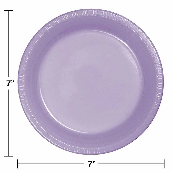 Details: Make entertaining simple at any large gathering or catered event with the Luscious Lavender Plastic Dessert Plates. The 7 inch round plate is strong enough for desserts and appetizers served at graduations, birthdays or weddings and the color coordinates with numerous theme ensembles. Each set of 20 plastic plates will help make the perfect foundation for any special event and sauces and juices from foods will not soak through! The plates can also be displayed inside larger theme plates for a nice accent. The Luscious Lavender Plastic Dessert Plates are sold For this price, you get one package containing (20) Luscious Lavender Purple Plastic Dessert Plates. Approximate Dimensions: 7 in x 7 in