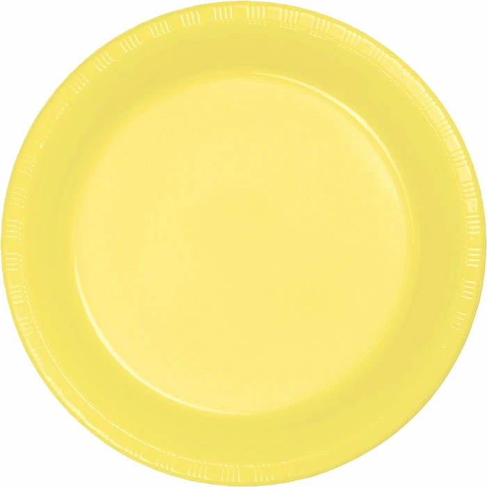 Details: Introduce delightful style and color to any large gathering or catered event with the Mimosa Plastic Banquet Plates. The 10.25 inch round plate is strong enough for larger meals served at graduations, birthdays or weddings and the color coordinates with numerous theme ensembles. Each set of 20 plastic plates will help make the perfect foundation for any special occasion and sauces and juices from foods will not soak through! The plates can also be used as serving dishes or chargers for smaller plates and dishes. The Mimosa Plastic Banquet Plates are sold For this price, you get one package containing (20) Mimosa Yellow Plastic Banquet Plates. Approximate Dimensions: 10.25 in x 10.25 in