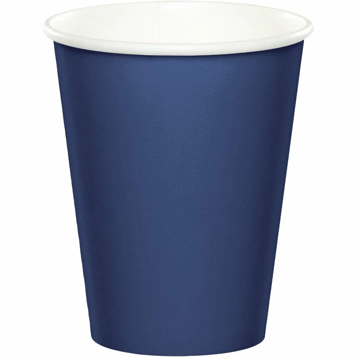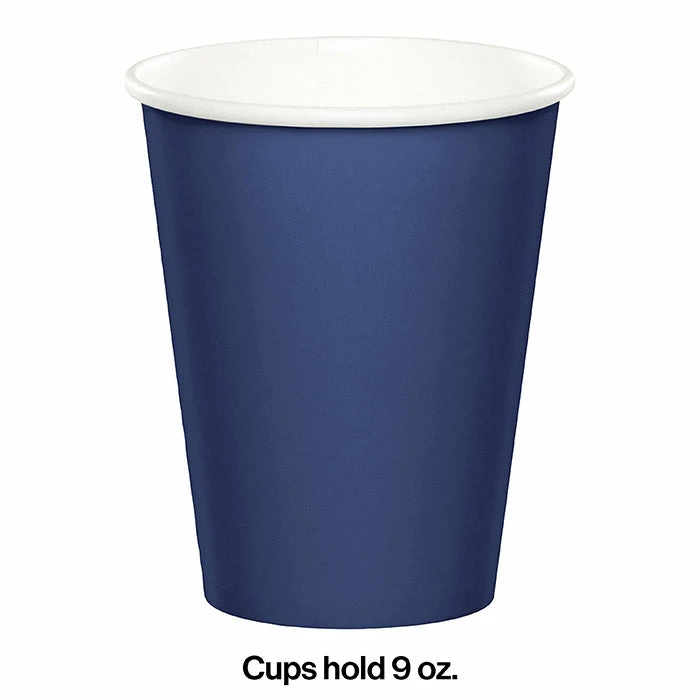 Details: To add bold accents and style to your catered event or gathering just set out the Navy Hot & Cold Cups. Every package contains 24 sturdy paper cups in navy that each hold 9 ounces of hot or cold beverages. Place these cups next to the punch bowl or coffee dispenser, or put one at each place setting for guests to use. The blue color is perfect for receptions, showers or reunions and the color coordinates with numerous theme ensembles. The Navy Hot & Cold Cups are packaged in quantities of 24 each. For this price, you get one package containing (24) Navy Hot/Cold Paper Paper Cups 9 Oz. Approximate Dimensions: 3.75 in