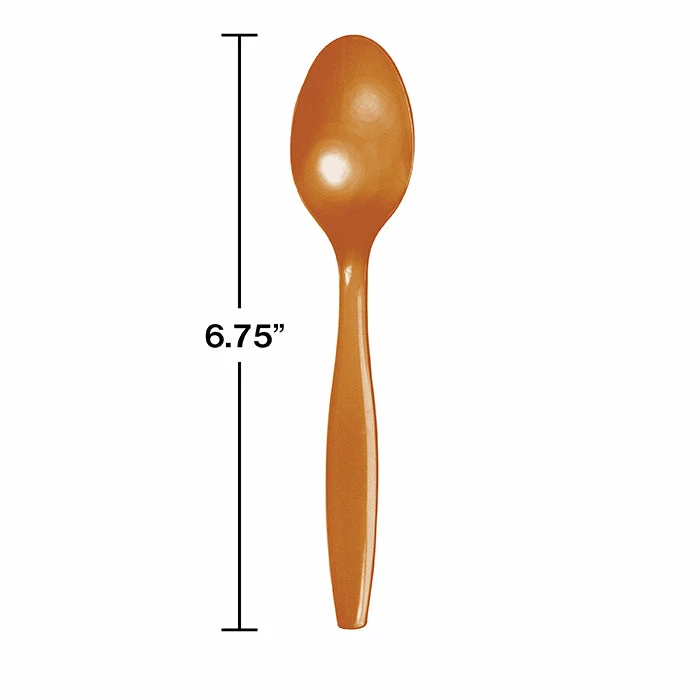 Details: Add a touch of color to your table setting with our stylish and sturdy Pumpkin Spice Orange Plastic Spoons. In addition to exceptional quality and great look, the wholesale plastic spoons are a cost-effective way to celebrate any number of large events like holiday parties, milestone birthdays, bridal showers and more. Constructed from premium plastic, the heavy duty plastic spoons are sturdy and strong enough to last the entire meal service or buffet with no concern over breakage. Perfect alternative to standard silverware, the disposable plastic spoons can be easily recycled at the end of the event. For this price, you get one package containing (24) Pumpkin Spice Orange Plastic Spoons. Approximate Dimensions: 6 in