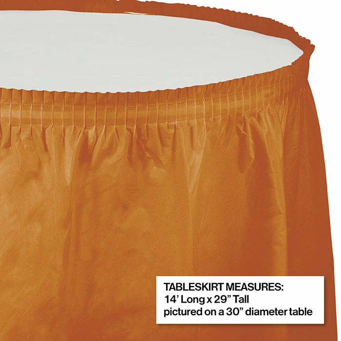 Details: Perfect for planning wedding receptions, showers, trade shows or any large event, our Pumpkin Spice Orange Plastic Table skirt add the perfect combination of great look, exceptional quality, and unbelievable convenience to your table setting. Constructed from premium plastic, the wholesale table skirts provide excellent waterproof barrier to the table. Additionally, the plastic table skirts are disposable for easy clean up. Measuring 14 feet x 29 inches, the heavy duty table skirts are intended to fit 6 to 8 foot banquet tables as well as small round tables. The disposable plastic table skirts can be conveniently recycled at the end of the event. You get one Pumpkin Spice Plastic Tableskirt, 14′ X 29″ for this price. Approximate Dimensions: 168 in x 29 in