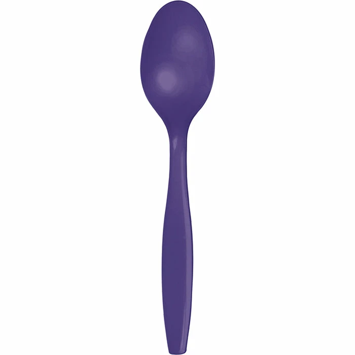 Details: Offer guests an exceptional dining experience that offers visual appeal in addition to delightful delicacies by setting dining tables or buffets with our Purple Plastic Spoons and other purple cutlery. These wholesale purple plastic spoons are ideal for large celebrations and catered events. Perfect for event planners and party hosts, these heavy duty purple spoons are durable enough to last through an entire meal service without worry over breakage. Our Purple Plastic Spoons are sold with discount pricing at competitive wholesale cutlery prices. They coordinate beautifully with our entire set of purple cutlery and can be mixed with plastic utensils in other hues to perfectly complement any party theme. For this price, you get one package containing (24) Purple Plastic Spoons. Approximate Dimensions: 6 in