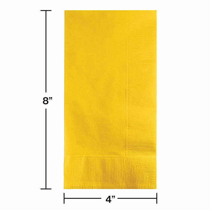 Details: Perfect for larger celebrations, our School Bus Yellow Dinner Napkins measure 4 inches x 8 inches with a 1/8th fold design. The premium 2-ply paper napkins lend themselves perfectly to lunch or dinner service while providing a more elegant feel. A great alternative to cloth napkins, the school bus yellow dinner napkins can simply be disposed of at the end of the event. Folded and table ready they are sure to be a hit with professionals and at home hostesses alike. For this price, you get one package containing (50) School Bus Yellow Dinner Napkins 2Ply 1/8 Fold. Approximate Dimensions: 8 in x 4 in