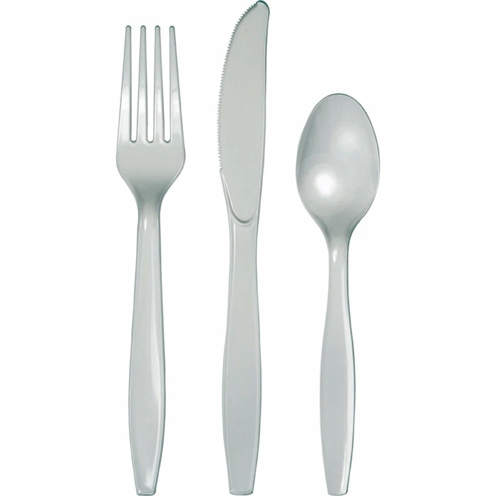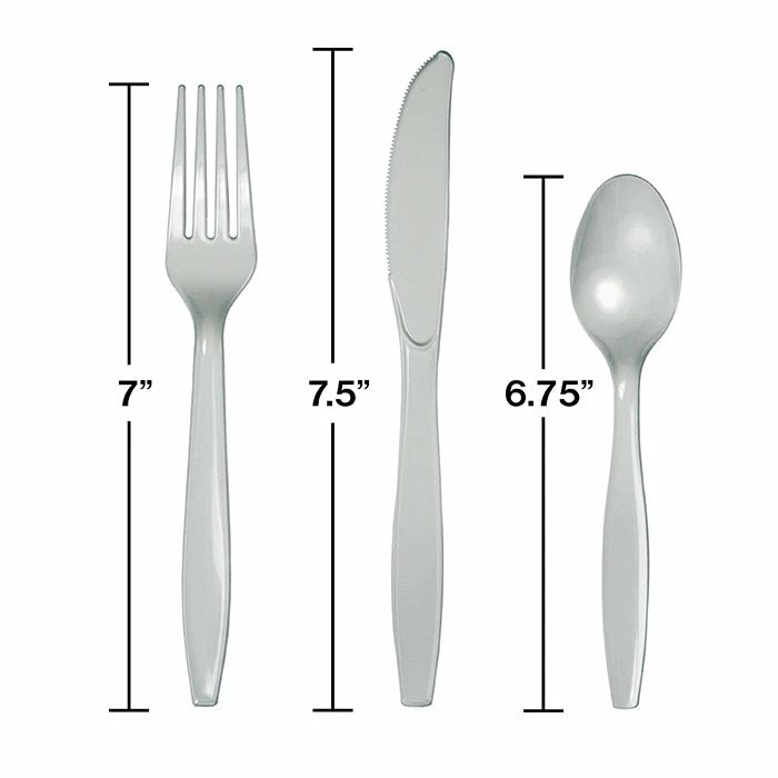 Details: Give your guests a premium dining experience that matches your party color atmosphere with the Shimmering Silver Cutlery Assortment. This elegant cutlery set comes with 6 forks 6 spoons and 6 knives. These heavyweight plastic utensils will bring a unique touch to your table setting. With discount pricing and great quality our Shimmering Silver Cutlery are perfect for event planners caterers and home hostesses alike. Material: Plastic