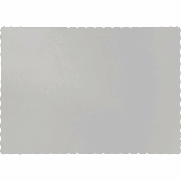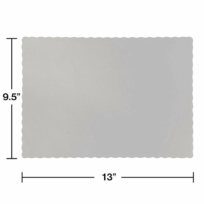 Details: Caterers, event planners, and brides on a budget will love providing a festive backdrop to the table setting or buffet display using these Shimmering Silver Placemats. Constructed of medium weight paper, the placemats look terrific and have the added bonus of being eco-friendly; simply toss into the recycle bin at the end of the event. Measuring 9.5 inches x 13.375 inches, the placemats feature a scalloped edge design for added detail. Ideal for large gatherings, the Shimmering Silver Placemats include 50 per package. For this price, you get one package containing (50) Shimmering Silver Placemats. Approximate Dimensions: 13.5 in x 9 in
