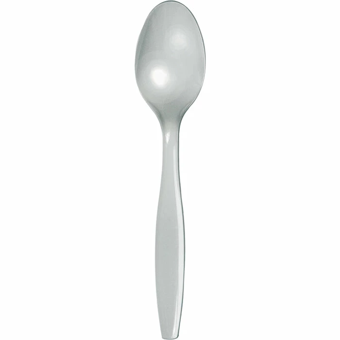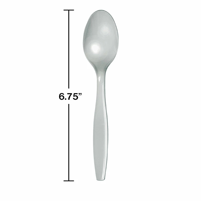 Details: Add the mesmerizing beauty of shining silver to any buffet or table setting with our Shimmering Silver Plastic Spoons and other silver cutlery. Constructed from premium plastic, these heavy duty silver spoons are durable enough to pair with standard party fare. Our shimmering silver wholesale plastic spoons are ideal for parties, large catered events, and even restaurants. These shimmering silver Plastic Spoons are sold with discount pricing at competitive wholesale cutlery prices. They coordinate beautifully with our entire set of shimmering silver plastic cutlery. For this price, you get one package containing (24) Shimmering Silver Plastic Spoons. Approximate Dimensions: 6 in