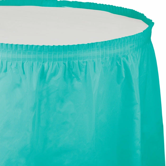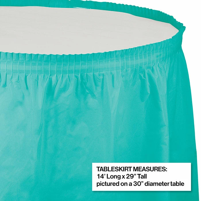 Details: Cover your larger tables with the Teal Lagoon Plastic Tableskirt. These tableskirts measure 14′ x 29″ and are made of plastic. It goes perfectly with any of our other Teal Lagoon party supplies. With discount pricing, our Teal Lagoon Plastic Tableskirt are perfect for event planners, caterers, and home hostesses alike. You get one Teal Lagoon Plastic Tableskirt, 14′ X 29″ for this price. Approximate Dimensions: 168 in x 29 in