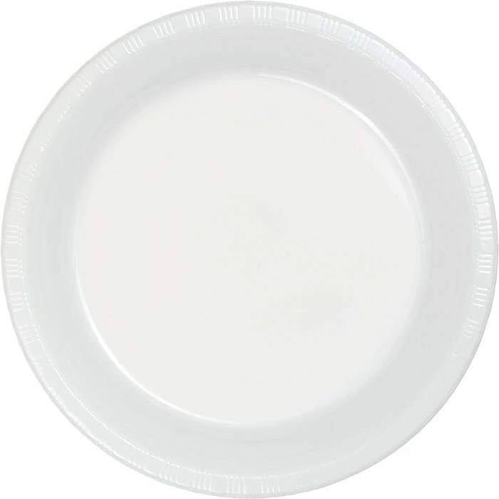 Details: Event planners, caterers, and brides on a budget will love the functionality of our White Dessert Plates while adding a clean and polished look to the special event. The 7 inch round plastic plates are a perfect alternative to pricier tableware rentals with no cleaning necessary and no worries over damage or loss. The plastic plates contain a slightly flexible center with a rigid outer edge and can be recycled (#6) or disposed of at the end of the celebration. Plastic dessert plates are designed for single use only and are not intended for microwave or dishwasher use. White Dessert Plates contain 20 per package. For this price, you get one package containing (20) White Prem Plastic Dessert Plates. Approximate Dimensions: 7 in x 7 in