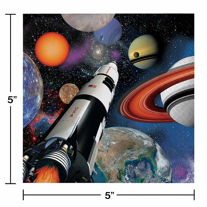Details: Enter the fantastic and unknown universe with creative decorations. Space Blast beverage napkins prominently feature many planets, including Earth, Mars, and Saturn. They are situated in a black starry sky with a gorgeous nebula in the background. These quarter fold paper napkins are excellent choices for banquet facilities, schools, and day care centers. The drink napkins can be used to easily decorate drink and dessert tables. Space Blast beverage napkins measure 4.938 inches square and are sold in packages of 16 each. For this price, you get one package containing (16) Space Blast Beverage Napkin, 3 Ply. Approximate Dimensions: 5 in x 5 in