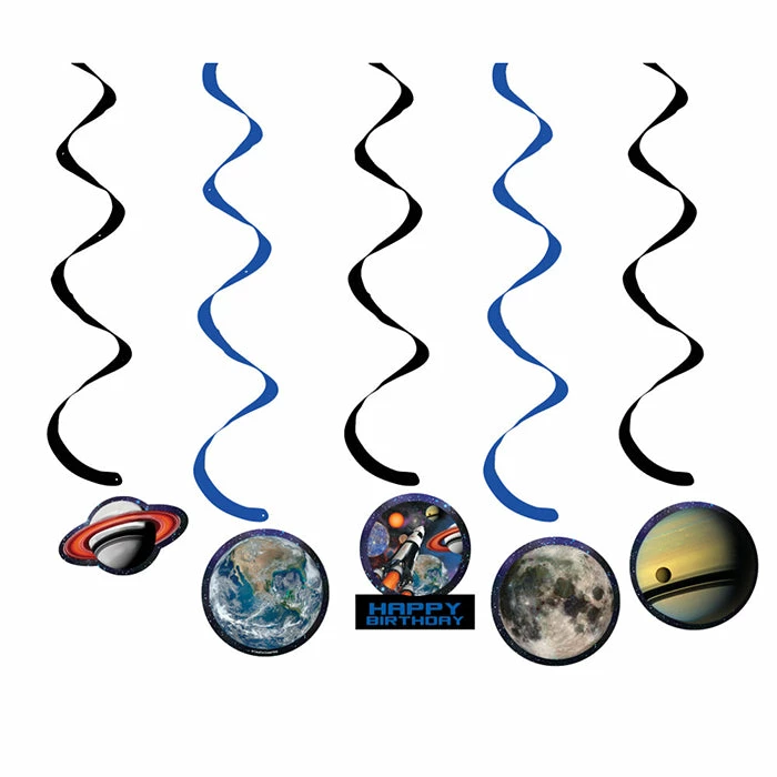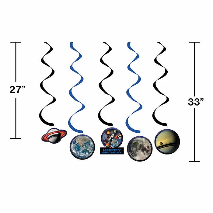 Details: Create an out of this world display for birthday celebrations with our wholesale Space Blast Swirl Decorations. Each set of 5 hanging decorations feature cardstock cutouts of planets and a rocket ship suspended from black and blue foil swirls. For a fun display, hang the danglers in a group or individually around the event space. For this price, you get one package containing (5) Space Blast Dizzy Danglers. Approximate Dimensions: 39 in