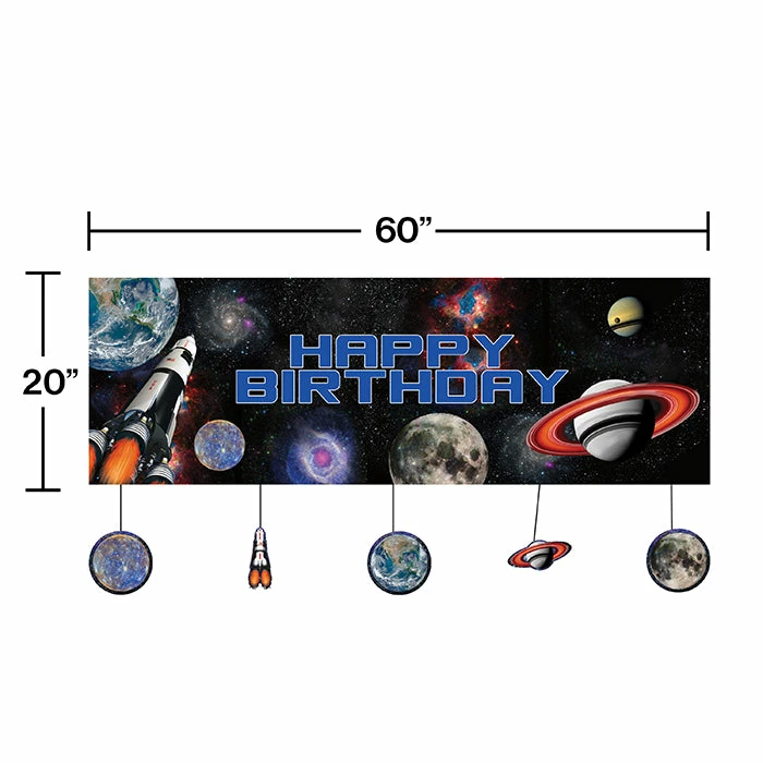 Details: Honor the birthday boy with “out of this world” party decorations like our wholesale Space Blast Giant Banners. Available in generous quantities, the jumbo party signs boast a cool design of the solar system with a “Happy Birthday” message in the center. Five cardstock cutouts are suspended from the bottom of each banner and include 3 planets, the moon, and a rocket. You get one Space Blast Giant Party Banner W/Att for this price. Approximate Dimensions: 60 in x 20 in