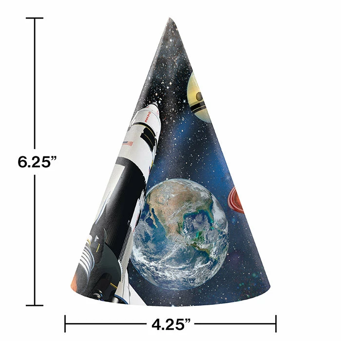 Details: Younger patrons will love feeling part of the action! Our Space Blast Party Hats will immerse them in the space theme with their white rocket launching into deep space. Featured on the child sized hats are planets, including Earth, Mars, Saturn and Jupiter. The starry background with fantastically colored nebulas completes the effect. Each hat is made of sturdy cardstock and has an elastic string attached for easily securing under the chin. These cone hats can be used by banquet halls, schools, and party supply retailers. The hats make great table setting decorations and coordinate well with other Space Blast tableware. Cone hats measure 6 inches by 4.25 inches and are sold in packages of 8. For this price, you get one package containing (8) Space Blast Party Hats. Approximate Dimensions: 4.25 in x 4.25 in x 6.25 in