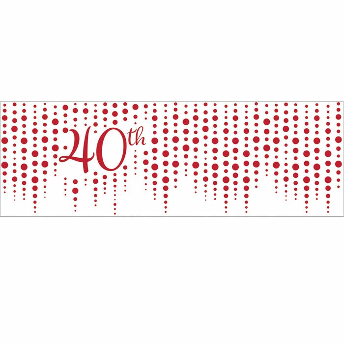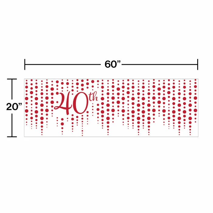 All the guests will be amazed when they see the Ruby 40th Anniversary Banner honoring the special couple. The hanging banner measures 60″ x 20″ and features a white and ruby theme with ruby circles and a printed “???40th”. These hanging banners coordinate with all Ruby 40th Anniversary party supplies. With wholesale pricing and bulk quantities our Ruby 40th Anniversary Banners 6 ct are perfect for event planners caterers and home hostesses alike.. Size: 60″ x 20″. Material: Plastic