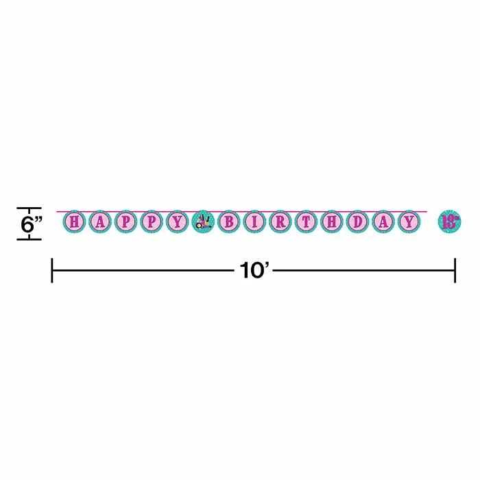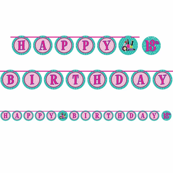 Details: Create the perfect party atmosphere with this Sparkle Spa Party Ribbon Banner. Each letter in “Happy Birthday” is written in a hot magenta color and is backed by pink leopard spots. Between each word, there is a group of makeup accessories and a piece hanging below that with “13th” on it. The banner measures 6″ x 10′ and can be coordinated with our other Sparkle Spa Party party supplies. With discount pricing, our Sparkle Spa Party Ribbon Banners are perfect for event planners, caterers, and home hostesses alike. You get one Sparkle Spa Party Ribbon Banner for this price. Approximate Dimensions: 122 in x 6 in