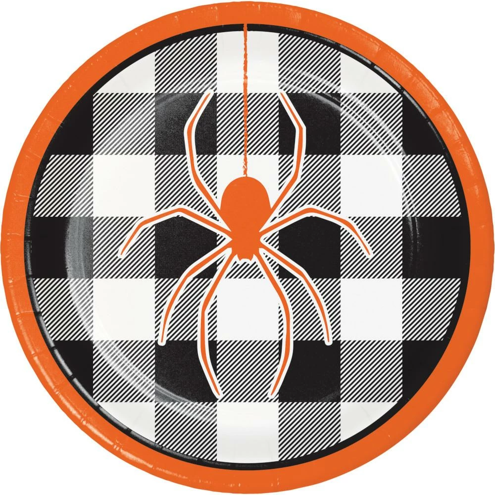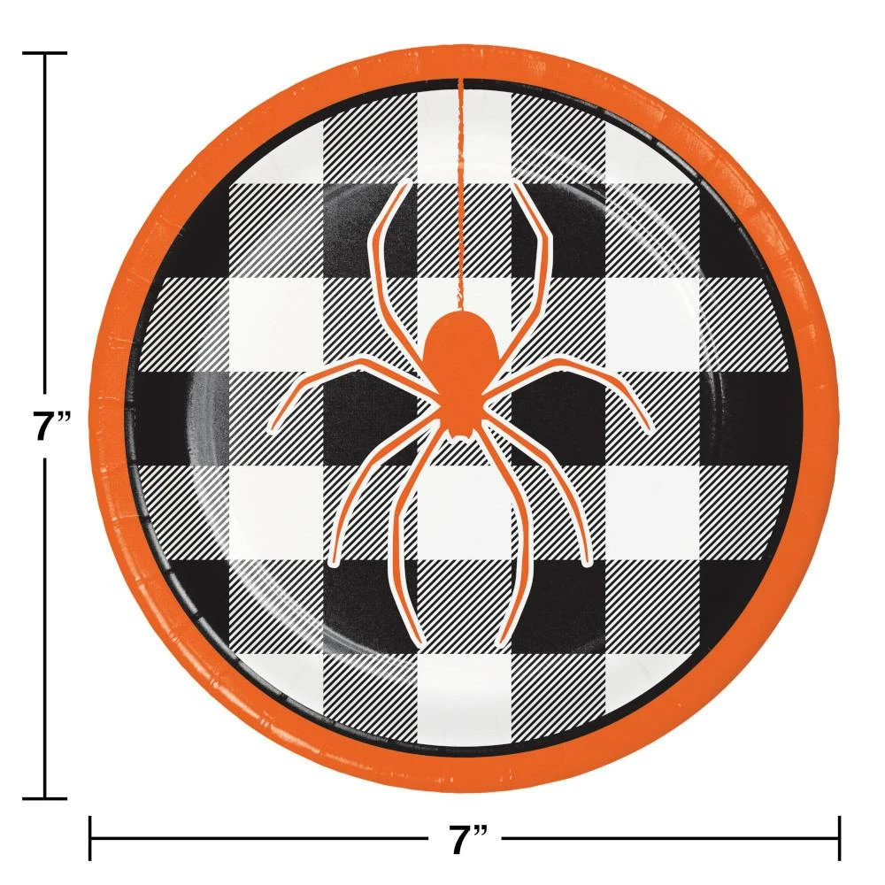 Details: ?áSave at PartyDecorations.com. Dangle your favorite treats when you serve dessert on the Spider Halloween Dessert Plates. These sturdy paper plates measure 7″ and feature an orange spider with a black and white flannel theme. Sold in packs of 96, these disposable paper plates coordinate with all Humorous Halloween party supplies. With wholesale pricing and bulk quantities, our Spider Halloween Dessert Plates 96 ct are perfect for event planners, caterers, and home hostesses alike.