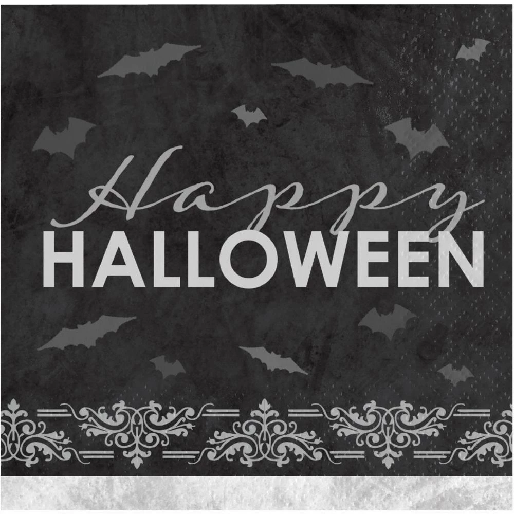 Details: Our Spider & Skull Beverage Napkin, 16 ct will make a great addition to your party!?á?áComplete your Halloween bash with our Happy Halloween Cocktail Napkins. These cocktail napkins measure 5 inches square and are made from soft and absorbent two-ply tissue, ideal for serving drinks, appetizers, and desserts. The napkins feature a black, white, and gray design of bats, Happy Halloween text, and a brocade accent, for a gothic-inspired look. Our Happy Halloween Cocktail Napkins are sold 16 napkins per package and coordinate with our other Halloween party supplies. Our Happy Halloween Beverage Napkins 16 ct are perfect for event planners, caterers, and home hostesses alike.