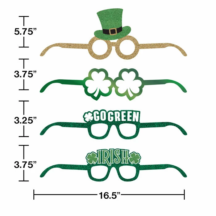 Everyone will be feeling lucky this St. Patrick’s Day when you get our St. Patrick’s Day Deluxe Paper Eyeglasses for your celebration. The paper glasses measure 2.5″ x 16″ flat. Each package includes four glasses designs, which feature elements such as shamrocks, “Go Green” text, “Irish” text, leprechaun hats, and more. Glitter and metallic foil touches make these glasses deluxe. Use these glasses for fun photo opportunities! Sold 24 glasses per package, complete the celebration with our other St. Patrick’s Day party supplies. With wholesale pricing and bulk quantities, our St. Patrick’s Day Deluxe Paper Eyeglasses 24 ct are perfect for event planners, caterers, and home hostesses alike.