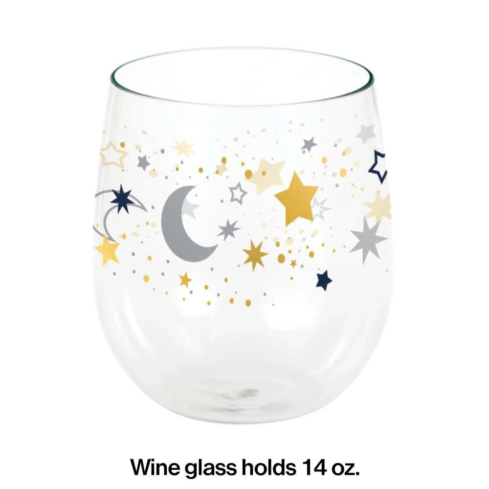 Details: Perfect for a crisp chardonnay or any other cold beverage, the Starry Night Plastic Wine Glasses add a little pizazz to any event. These sturdy plastic glasses hold 14 oz and feature foil stars and moons with a navy, silver, and gold theme. Sold in packs of 1, these disposable plastic glasses coordinate with all Starry Night supplies. Our Starry Night Plastic Wine Glasses are perfect for event planners, caterers, and home hostesses alike.