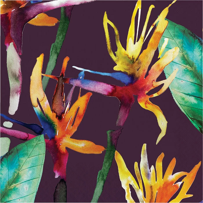 Details: Add some color to your table with the Bold Tropics Napkins. Measuring 6.5″ these napkins display tropical leaves and exotic florals such as bird of paradise in vibrant colors on a dark violet background. Pair them up with plates in Coral Red Gold Teal or Linen colors. These disposable napkins perfectly accentuate other Bold Tropics party supplies. With discount pricing and great quality our Bold Tropics Luncheon Napkins are perfect for event planners caterers and home hostesses alike. Approximate Size: 6.5″ x 6.5″ 1/4 Fold. Material: 3-Ply Tissue