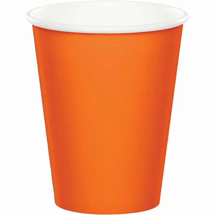 Details: Event planners and budget savvy hostesses will love to stretch their party dollar using these inexpensive party cups that are sturdy enough for hot and cold beverages while still offering a lively pop of color aside a festive party punch. The Sunkissed Orange Cups coordinate perfectly with other tableware items in the same hue but can also be combined with party supplies in complementary solid colors. Perfect for large events the Sunkissed Orange Hot & Cold Cups include 24 per package. For this price, you get one package containing (24) Sunkissed Orange Hot/Cold Paper Paper Cups 9 Oz. Approximate Dimensions: 3.75 in