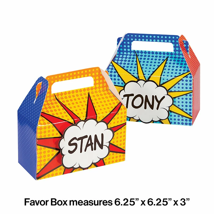 Details: Send your heroes home with something special in these Superhero Party Treat Boxes. Featuring different boxes with superhero phrases on them, these are perfect for any small treats and goodies. Measuring 6.25″ x 6.25″ and These boxes can be paired with any other Superhero Party party supplies. Our Superhero Party Treat Boxes are perfect for event planners, caterers, and home hostesses alike.