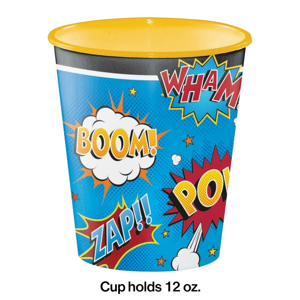 Details: Being a superhero is a tough job. Keep your heroes refreshed with these Superhero Slogans Plastic Cups. This cup holds 12 oz and features a blue background and superhero action sounds like “Boom”, “Pow” and “Wham”. The cups can be coordinated with any of our other Superhero Slogans party supplies. With discount pricing, our Superhero Slogans Plastic Cups are perfect for event planners, caterers, and home hostesses alike. You get one Superhero Slogans Plastic Cups, 12 Oz for this price. Approximate Dimensions: 3.75 in