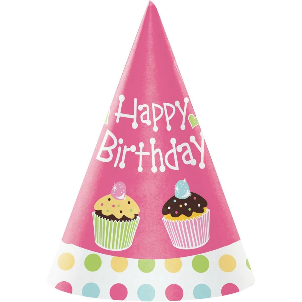 Satisfy your sweet tooth! Our Sweet Treats Party Hats convey a special ”appy Birthday” message in a juvenile type font with a row of tasty cupcakes underneath. The pink cone shaped hat also has a band of white around the bottom with blue, green, yellow, and pink dots as well as an elastic chin strap for easy wearing. Reserve seats for the birthday party or complete favors with this durable party hat which can also be used in coordination with the wholesale Sweet Treats party supplies. Child size hat is sold in quantities of 8 per package with 6 packages per case.
