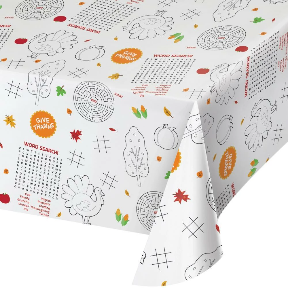 Details: Our Tablecover, Paper, Thanksgiving Activity will make a great addition to your party! This Thanksgiving, entertain your children for hours when you set their table with the Thanksgiving Activity Paper table cover. These paper tablecovers measure 54″ x 88″ and feature autumn-themed games and activities with a black, orange, and white theme. Our Thanksgiving Activity Paper table covers are perfect for event planners, caterers, and home hostesses alike.