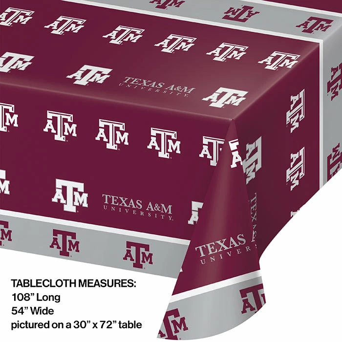 Details: The college sports season is year round so let the Aggie fans decorate tables in spirited style with the Texas A&M University table cover. Each sturdy plastic table cover measures 54 by 108 inches and is design to fit an 8-foot rectangular table. The cover features wide sections of maroon bordered by stripes of white and grey, all the areas printed with numerous school insignia and the words “Texas A&M University”. Coordinate the table cover with other theme party supplies for a super celebration. The wholesale quantity of table covers is attractive to event planners, sports venue concessions, party supply resellers and caterers. Get the crowd in the spirit with the Texas A&M University table cover sold at a discount price. You get one Texas A And M University Plastic table cover, 54″ X 108″ for this price. Approximate Dimensions: 108 in x 54 in