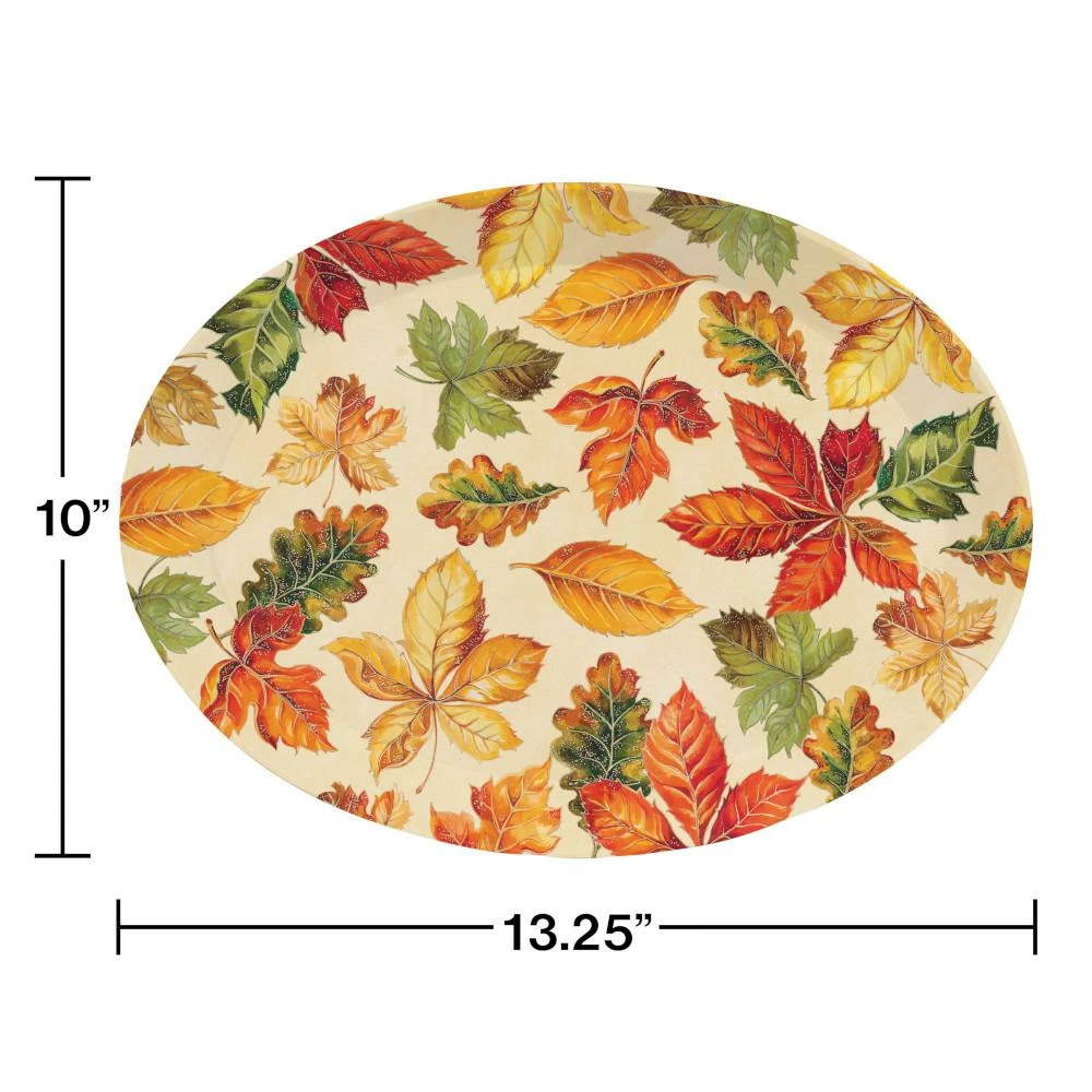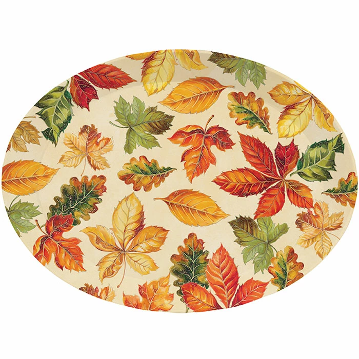 Details: The beautiful Fall Leaves Oval Plastic Tray is ideal for serving appetizers or drinks. These sturdy oval plastic trays measure 10″ x 13.25″ and feature a pattern of autumn leaves with a burgundy, orange, green, and ivory theme. sold in packs of 1, these plastic trays coordinate with all Fall Leaves party supplies. Our Fall Leaves Oval Plastic Trays are perfect for event planners, caterers, and home hostesses alike.