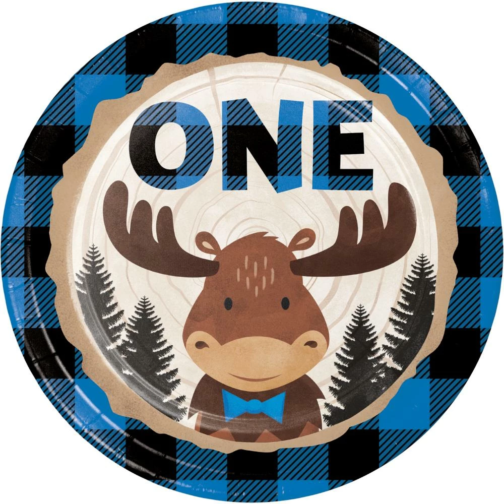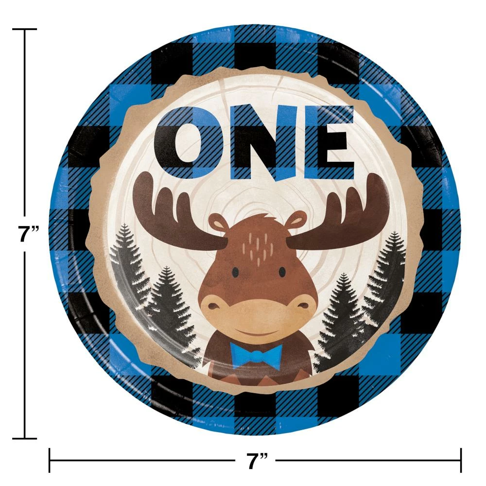 Details: Bring a smile to your little one’s face when you serve their chocolate birthday cake on the Blue Buffalo Plaid Moose Dessert Plates. These sturdy paper plates measure 7″ and feature a smiling moose and the word “One” with a blue, brown, and black theme. Sold in packs of 8, these disposable paper plates coordinate with all Blue Buffalo Plaid Moose party supplies. Save more on party decorations, party favors and party supplies at PartyDecorations.com!. Material: Paper Boardstock. Approximate Size/Dimensions (inches): 6.875 x 6.875.