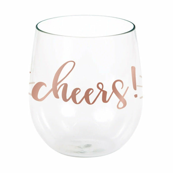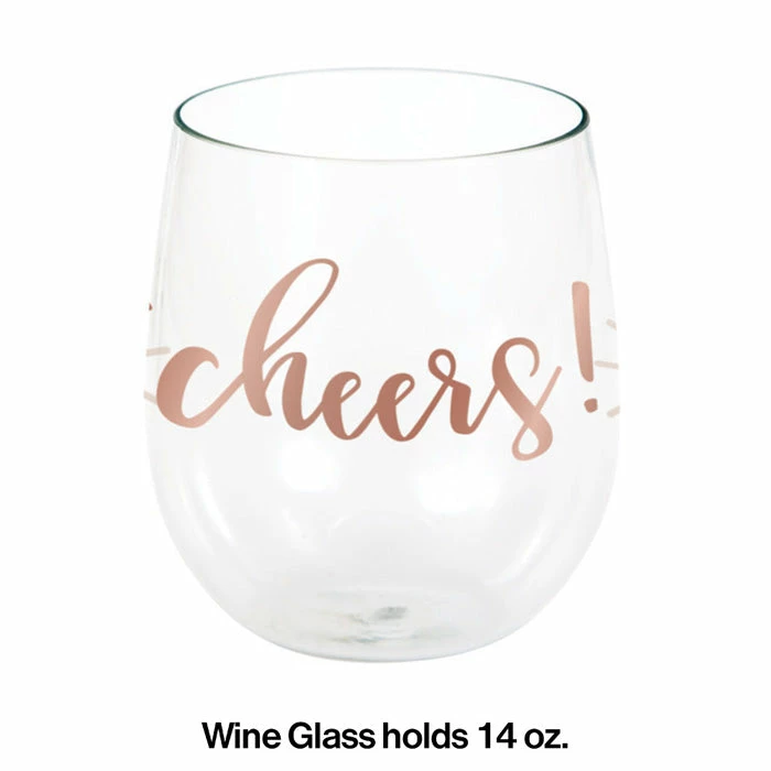 Details: Let the party begin when you use the Rose All Day Cheers Plastic Stemless Wine Glass. The clear plastic wine glass holds 14 oz and features a rose gold theme with the word “Cheers!”. The plastic stemless wine glass coordinates with all Rose All Day party supplies. With discount pricing and great quality our Rose All Day Cheers Plastic Stemless Wine Glasses are perfect for event planners caterers and home hostesses alike. Approximate Size: 14 oz. Material: Plastic
