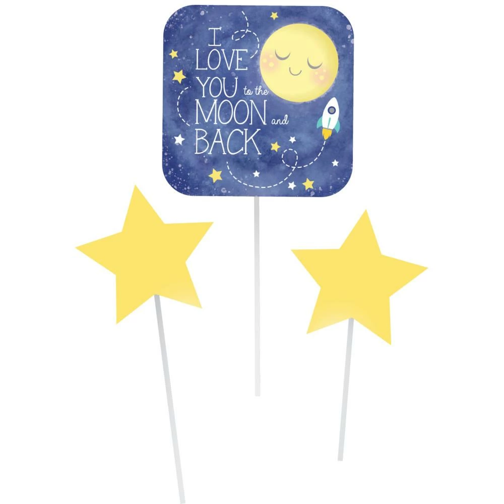 Decorate your table setting to match the special occasion by adding in the To the Moon and Back Centerpiece Sticks. The decoration includes 2 stars and a large square cutout with a moonlit sky and stars in the background. These centerpiece sticks are an excellent addition to baby showers. With wholesale pricing and bulk quantities, our To the Moon and Back DIY Centerpieces Sticks 18 ct are perfect for event planners, caterers, and home hostesses alike.