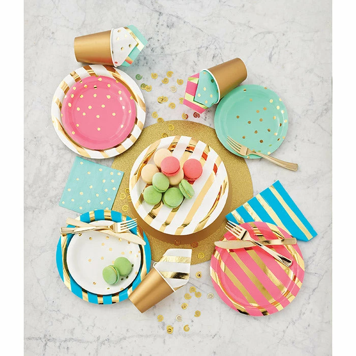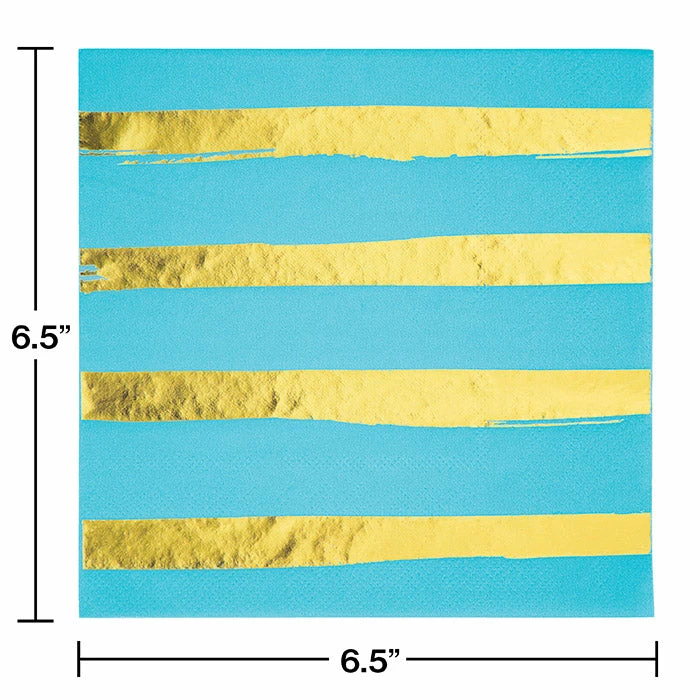 Details: Dazzle your guests with these Bermuda Blue and Gold Foil Striped Napkins. Covered with a beautiful Bermuda Blue with solid Gold stripes, these luncheon napkins make the perfect addition to any celebration. The trendy foil stamped napkins measure 6.5″. With discount pricing, our Bermuda Blue and Gold Foil Striped Luncheon Napkins are perfect for event planners, caterers, and home hostesses alike. For this price, you get one package containing (16) Toc Bermuda Blue Foil Luncheon Napkin 3Ply, Foil Stamped. Approximate Dimensions: 6.4 in x 6.4 in