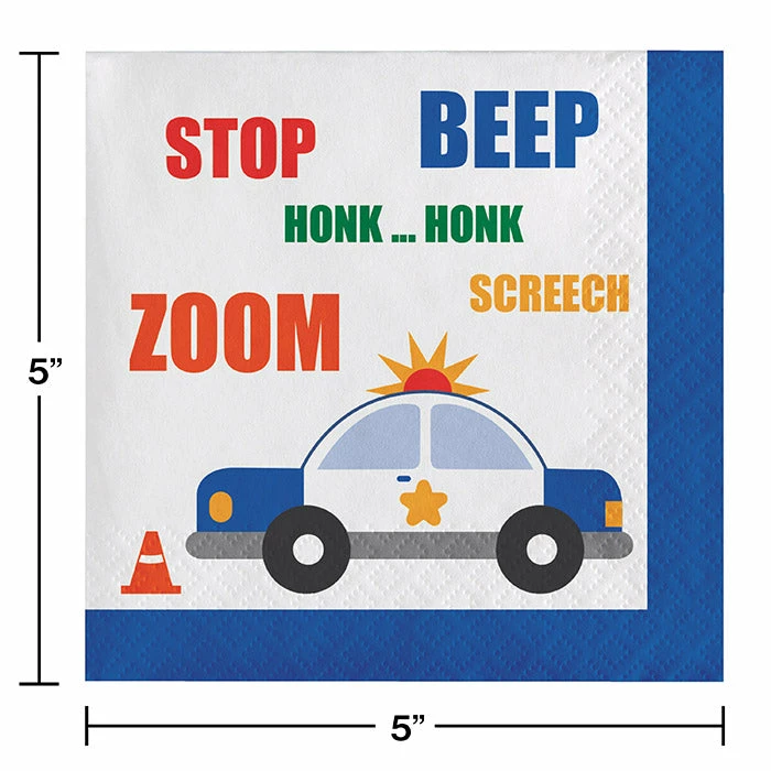 Details: Send patrons zooming over to the event with themed party supplies. Coordinating with the Traffic Jam theme, Traffic Jam Beverage Napkins feature a police car with traffic related sayings like Zoom and Beep. With a blue border on 2 sides, the drink napkin is 2-ply and sized for use with beverages and appetizers. With quality packaging of 192 count, these disposable napkins are ideal for use by event planners and party centers. In cheerful primary colors, beverage napkins measure 4.938″ square and have a quarter fold design. Napkins arrive in retail-ready packaging of 16 each. For this price, you get one package containing (16) Traffic Jam Beverage Napkins. Approximate Dimensions: 5 in x 5 in