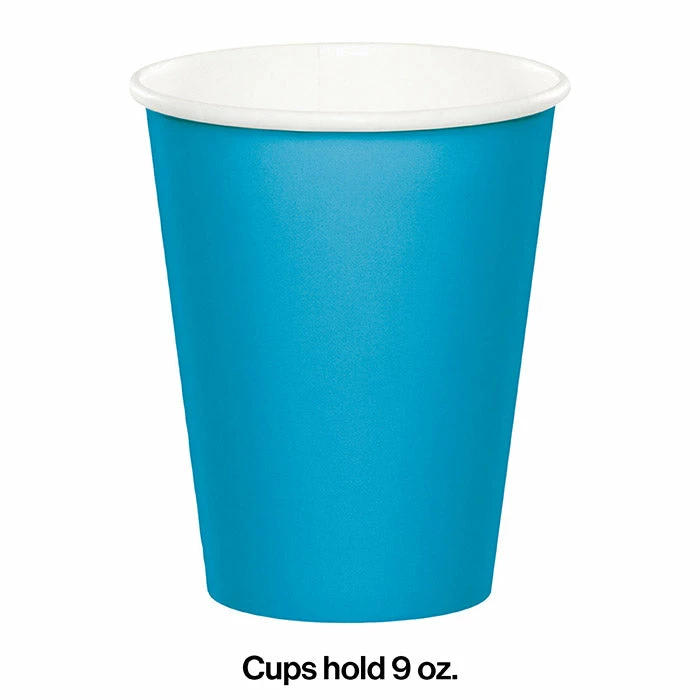 Details: Event planners and budget savvy hostesses will love to stretch their party dollar using these inexpensive party cups that are sturdy enough for hot and cold beverages while still offering a lively pop of color aside a festive party punch. The Turquoise Cups coordinate perfectly with other tableware items in the same hue but can also be combined with party supplies that feature turquoise accents. Perfect for large events the Turquoise 9 Ounce Cups include 24 per package. For this price, you get one package containing (24) Turquoise Hot/Cold Paper Paper Cups 9 Oz. Approximate Dimensions: 3.75 in