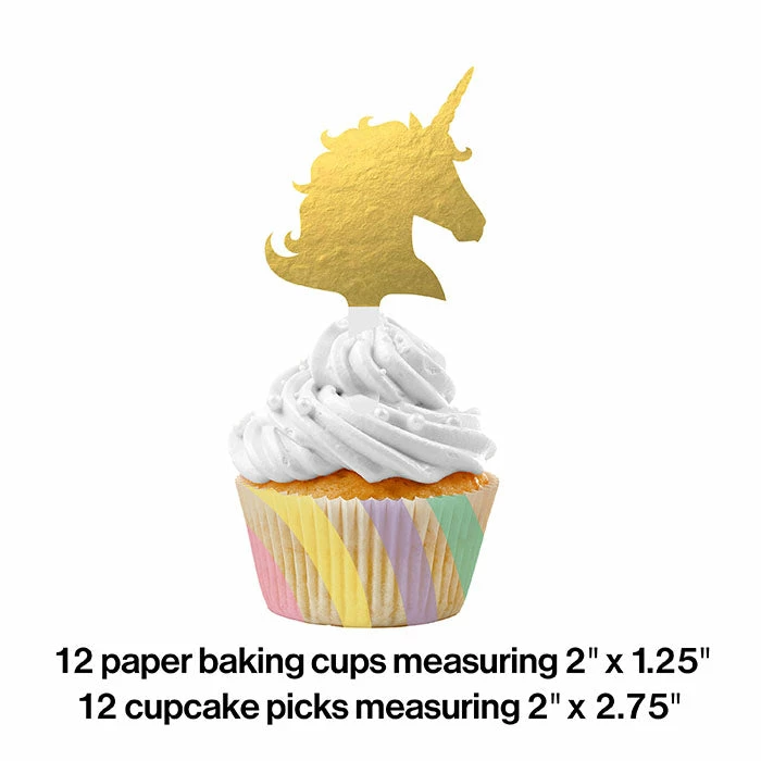 Details: Stylishly serve party cupcakes with help from our Sparkle Unicorn Cupcake Kit. Each kit contains 12 standard cupcake baking cups (2″ diameter x 1.25″ height) and 12 unicorn picks (2.75″ height x 2″ width). The baking cups feature a pastel rainbow striped design, while the unicorn picks feature a plastic pick with a metallic gold foil unicorn silhouette. This cupcake kit coordinates with our other unicorn party supplies. Grab these for your celebration today! With discount pricing, our Sparkle Unicorn Cupcake Kits are perfect for event planners, caterers, and home hostesses alike. For this price, you get one package containing (12) Unicorn Sparkle Cupcake Kits.
