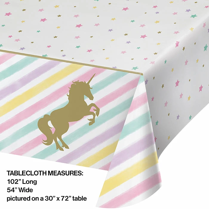 Details: Cover all aspects of your party with the Sparkle Unicorn Plastic table cover. The elegant Gold, Fresh Mint, and Classic Pink colors along with a majestic gold unicorn are seen throughout this table cover, making it the perfect addition to our other Sparkle Unicorn decoration! The table covers measure 54″ x 102″. With discount pricing, our Sparkle Unicorn Plastic table covers are perfect for event planners, caterers, and home hostesses alike. You get one Unicorn Sparkle Plastic Tablecover All Over Print, 54″ X 102″ for this price. Approximate Dimensions: 102 in x 54 in