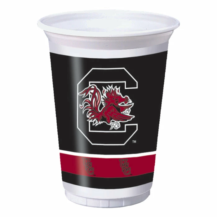 Details: All the fans can give cheers for University of South Carolina with University of South Carolina Plastic 20 ounce Cup. Plastic cups are a convenient for use in settings where glass is not allowed like an outdoor restaurant patio, a grassy area, or in a beach setting. White plastic cups hold 20 ounces of a cold beverage and have garnet and black stripes along the bottom edge with the letters “USC”. The middle of the cup has a black band with the letter “C” and the image of the Fighting Gamecock. Disposable cups are fun for casual functions and provide easy clean-up. Each package contains 8 cups. For this price, you get one package containing (8) University Of South Carolina 20 Oz Plastic Cups. Approximate Dimensions: 5 in