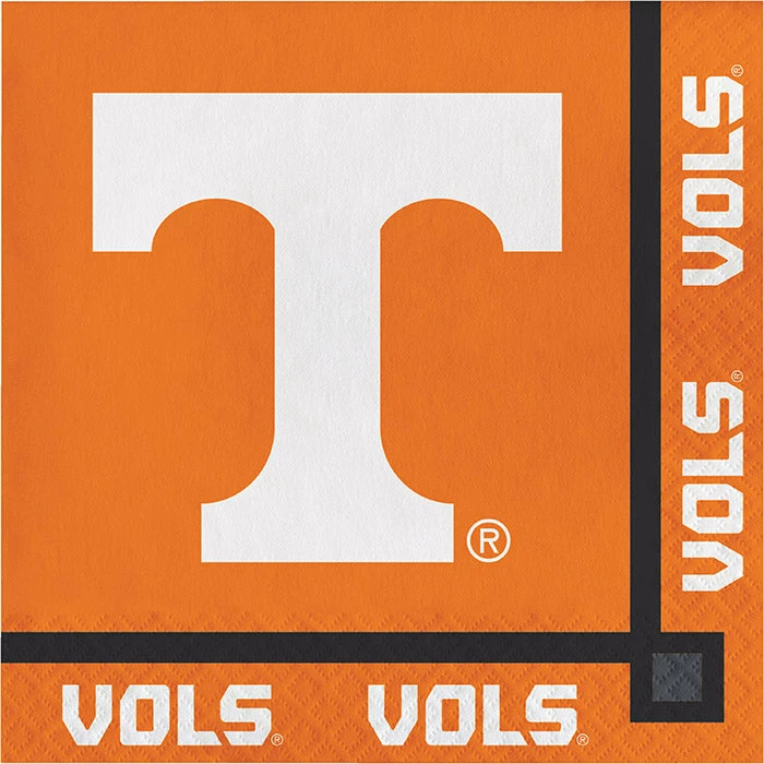 Support the sports fans and celebrate school spirit by setting out the Tennessee University Beverage Napkins for banquets, tailgate parties, or any restaurant or cafeteria venue supporting the school. Each 2-ply paper napkin features an orange background stamped with a large white block letter T. A black stripe on two sides separates the logo from the orange outer border which is printed with ”ols” along two sides. The bulk quantity and competitive market pricing make this napkin a great choice for party supply resellers, sports venue concessions, event planners or cafeterias. Get in the school spirit and combine the napkin with solid-colored tableware or other supplies in the theme for a great presentation. The Tennessee University Beverage Napkin is sold in quantities of 20 per package with 12 packages per case.