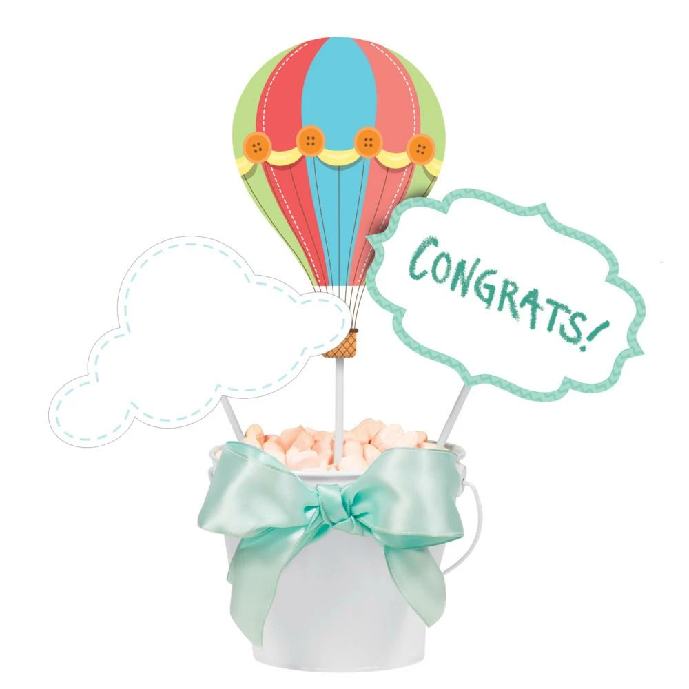 These wholesale centerpiece sticks are a colorful decorative addition to balloon centerpieces, flower bouquets, food and dessert tables, or candy dishes. The Up, Up & Away Centerpiece Sticks are creatively designed to match every balloon theme baby shower celebration. These beautiful, disposable party sticks come in three different sizes featuring a sign with “CONGRATS!” quote, a colorful balloon, and a white cloud. They are a beautiful table decoration for every baby shower celebrations, boy or girl. Customers receive 18 Up, Up & Away Centerpiece Sticks in a case for this price.