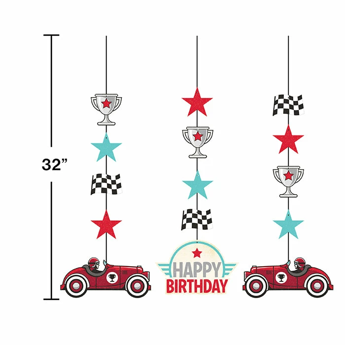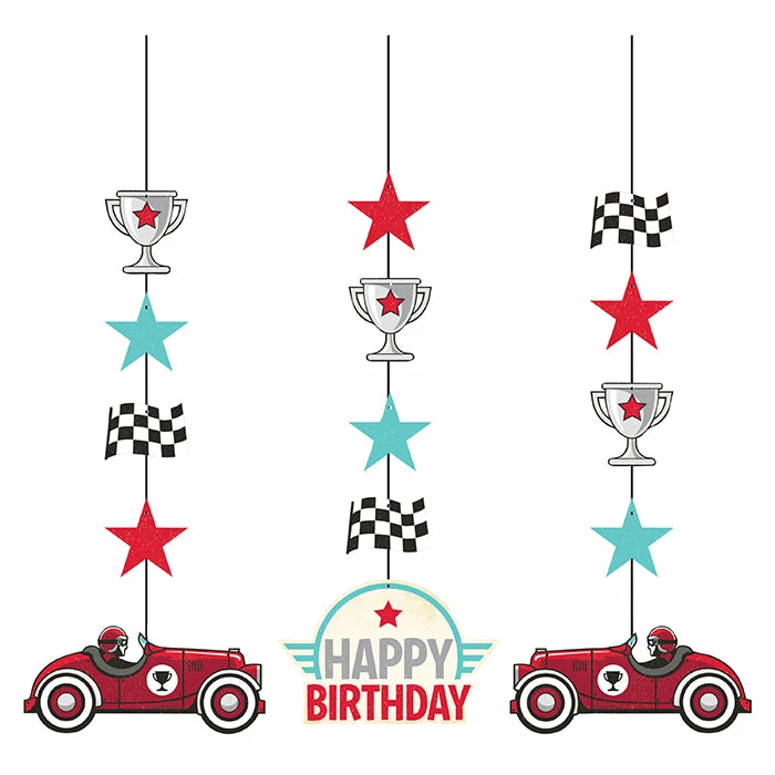 Details: Decorate your vintage car-themed birthday party with our Vintage Race Car Hanging Cutouts. The hanging cutouts feature red race cars, stars, checkered flags, trophies, and “happy birthday” text. Measuring 32″, hang them above the party space to tie the room together. Complete the look with our other Vintage Race Car party supplies. Our Vintage Race Car Hanging Cutouts are perfect for event planners, caterers, and home hostesses alike.