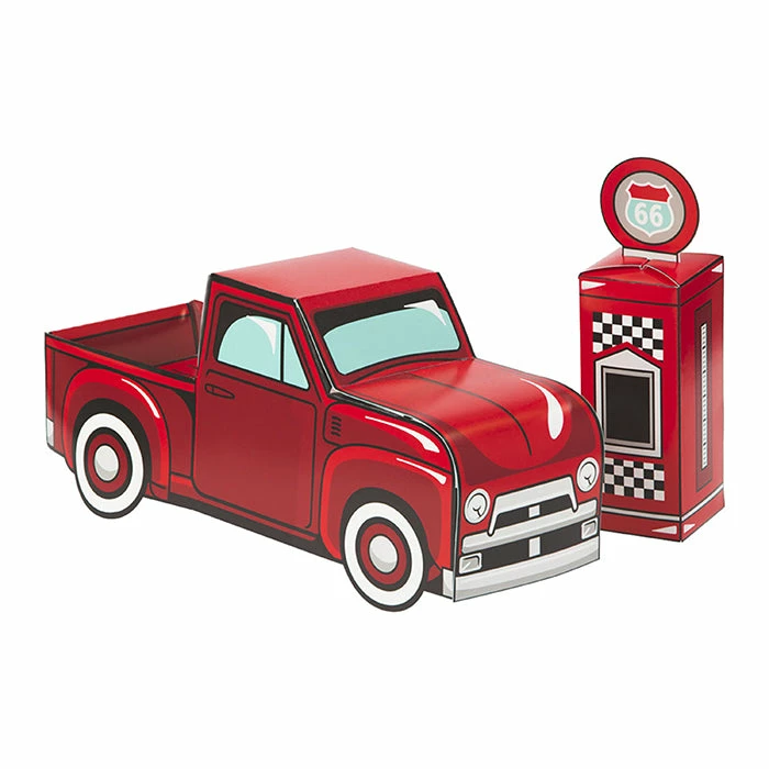 Details: Create the perfect centerpiece for your vintage red truck party with our Vintage Red Truck Centerpiece. This 3D centerpiece includes two pieces, a vintage red truck (11.25″ x 5″) and a vintage gas pump (2.25″ x 7″). Place them on the cake or gift table to set a fun scene. Complete the look with our other Vintage Red Truck party supplies. Our Vintage Red Truck Centerpieces are perfect for event planners, caterers, and home hostesses alike.