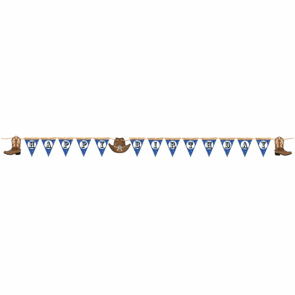 Add a punch of Western theme to your party space with this Blue Bandana Cowboy Pennant Banner. The birthday party hanging decoration features a dark blue bandana background with rope designs along the top. Attach to the mantel, string along the edges of tables, or pair with coordinating balloons to create a fun photo backdrop. With wholesale pricing and bulk quantities, our Blue Bandana Cowboy Pennant Banners 12 ct are perfect for event planners, caterers, and home hostesses alike.
